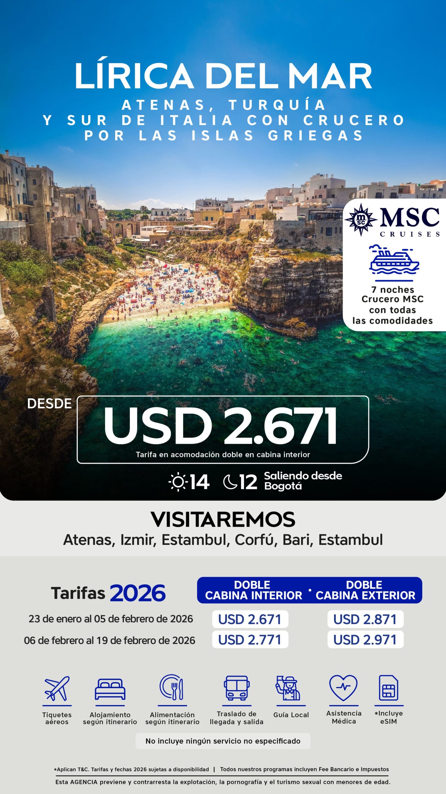 - 7 noches a bordo del Crucero MSC Lirica en cabina interior (sujeta a disponibilidad).