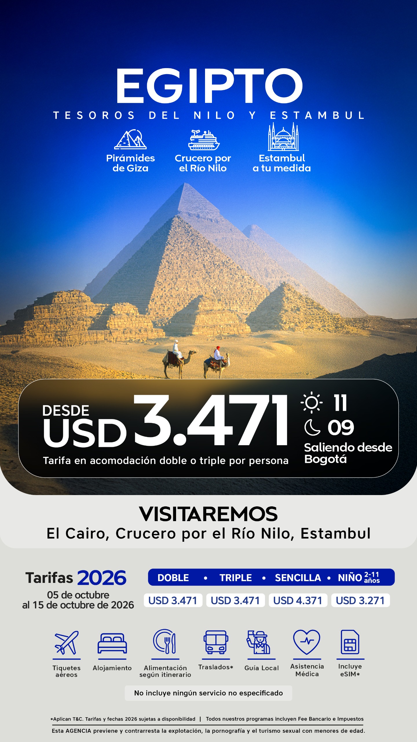 Empieza esta aventura abordando el vuelo internacional con destino a Estambul, ciudad de conexión que marca el inicio del cambio de ritmo, los husos horarios y la emoción de estar en camino. Desde aquí, continuamos en vuelo hacia El Cairo, donde la experiencia tomará forma.