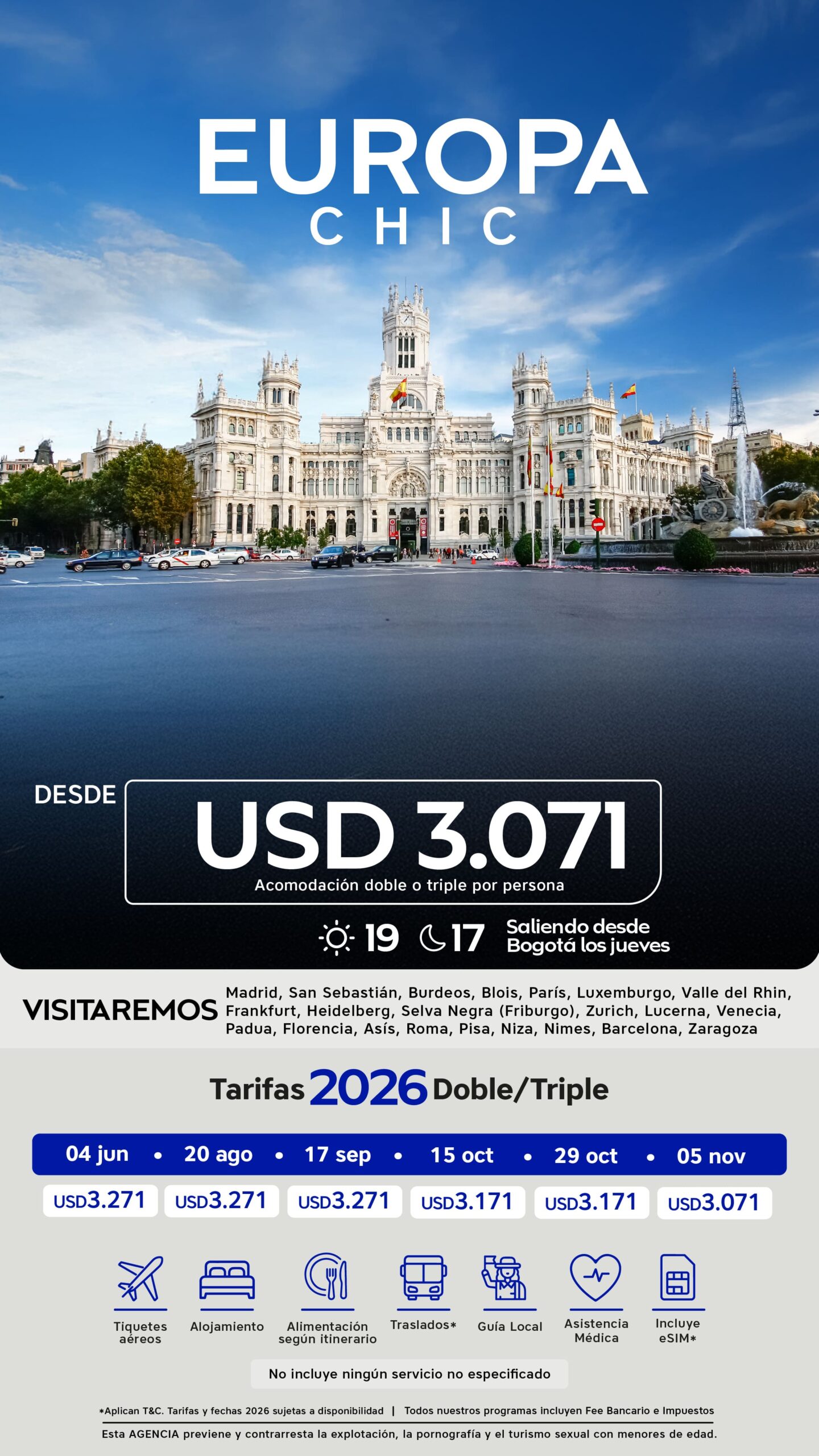 | 20 de agosto al 07 de septiembre de 2026 17 de septiembre al 05 de octubre de 2026 | USD 3.271 | USD 4.471 | USD 2.771 |