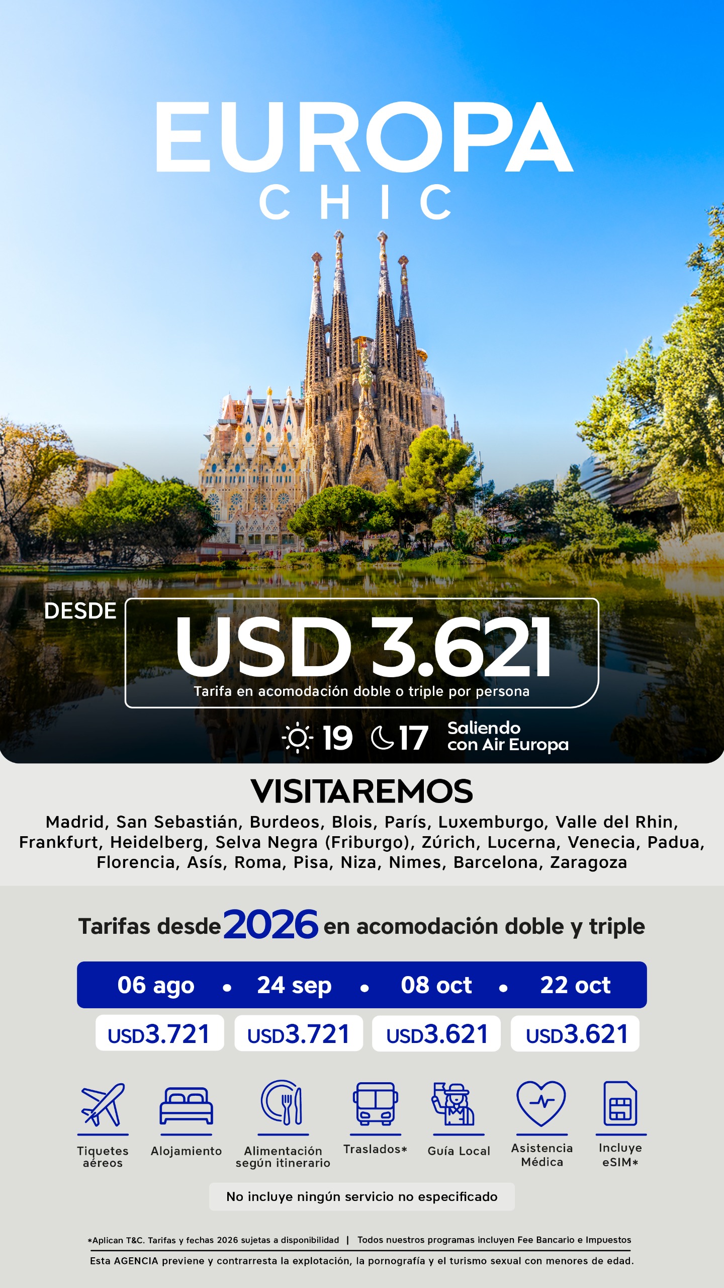 24 de septiembre al 12 de octubre de 2026 | USD 3.771 | USD 4.971 | USD 3.471 |