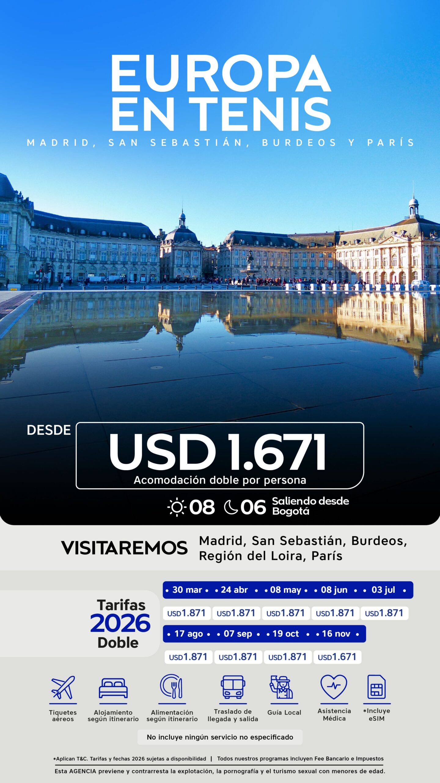 08 mayo al 15 mayo de 2026 (V) 08 junio al 15 junio de 2026 (L) 03 julio al 10 julio de 2026 (V) | USD 1.871 | USD 2.371 | USD 1.671 |