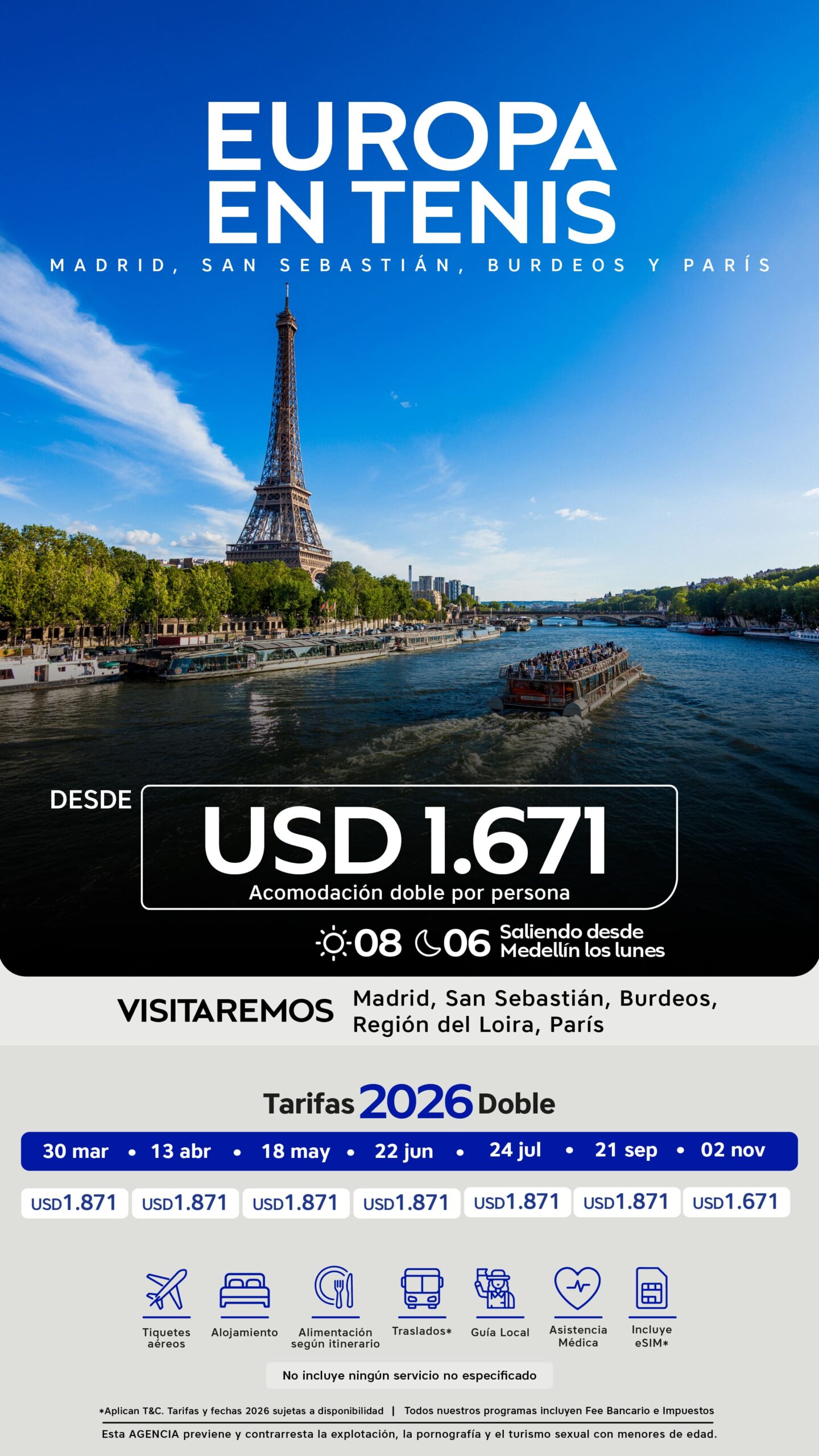 - Tiquetes aéreos con impuestos incluidos en la ruta Medellín – Madrid // Paris – Medellín, operados por la aerolínea Avianca, con una pieza de equipaje facturado de hasta 23 kg. (La ruta aérea puede tener tramos vía Bogotá según operación de la aerolínea)