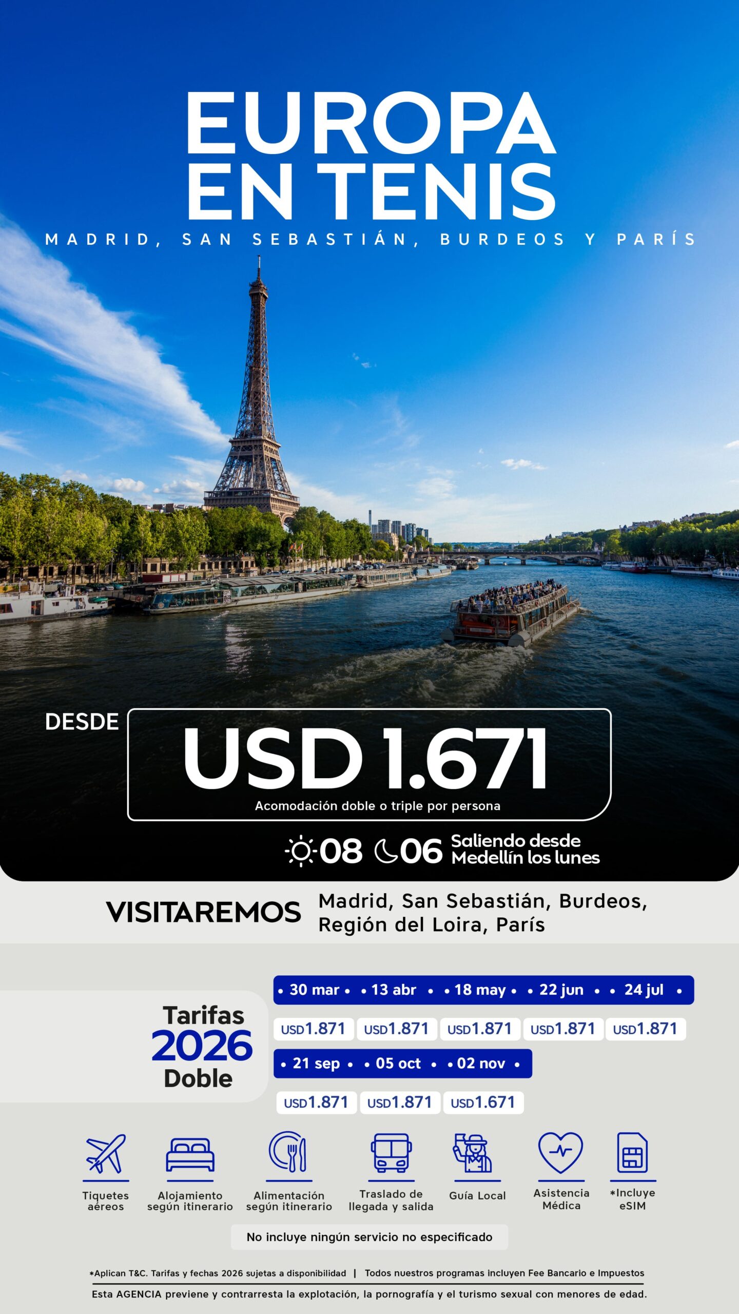 - Tiquetes aéreos con impuestos incluidos en la ruta Medellín – Madrid // Paris – Medellín, operados por la aerolínea Avianca, con una pieza de equipaje facturado de hasta 23 kg.