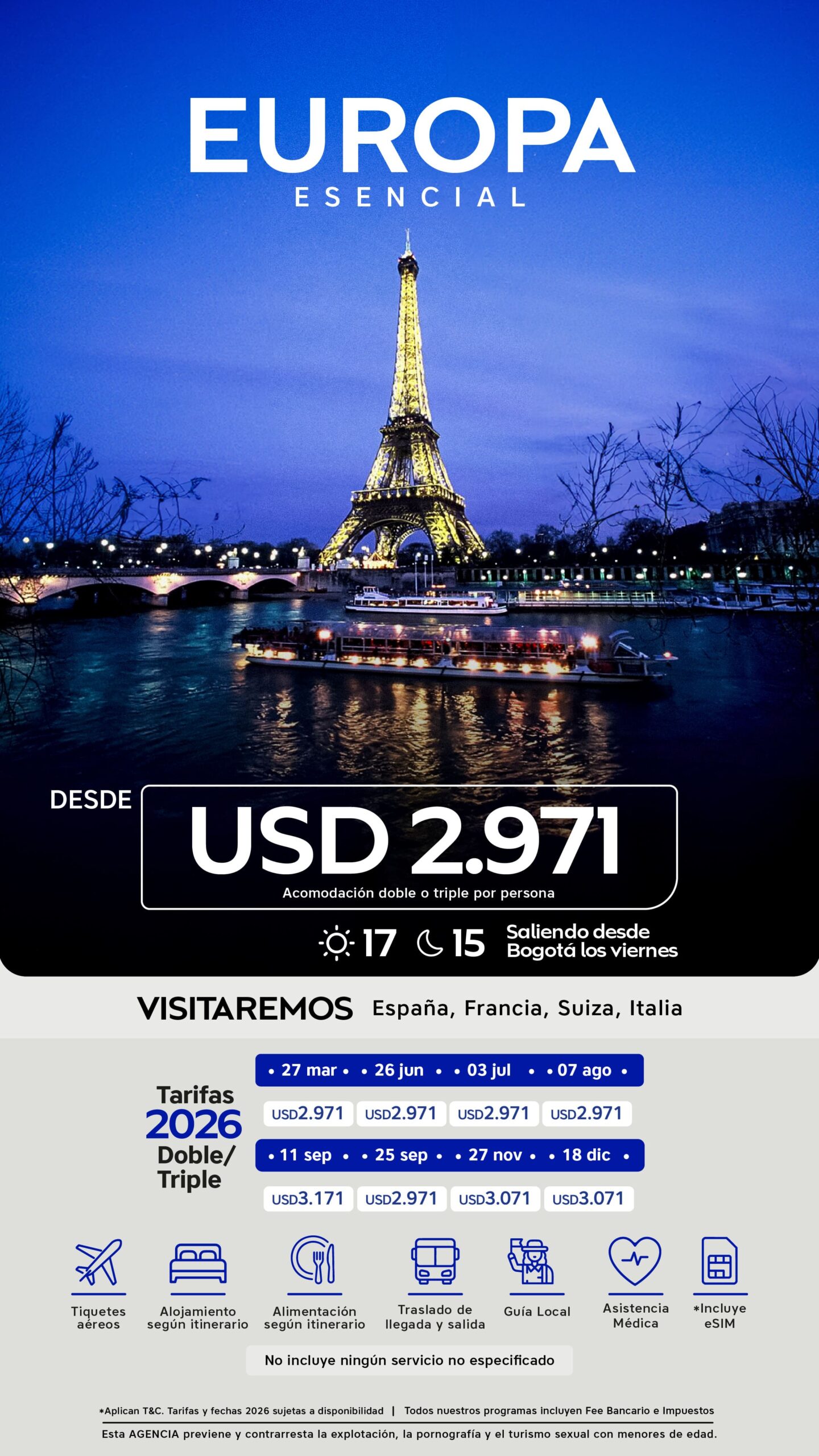 07 de agosto al 23 de agosto de 2026 | USD 2.971 | USD 3.971 | USD 2.671 |
