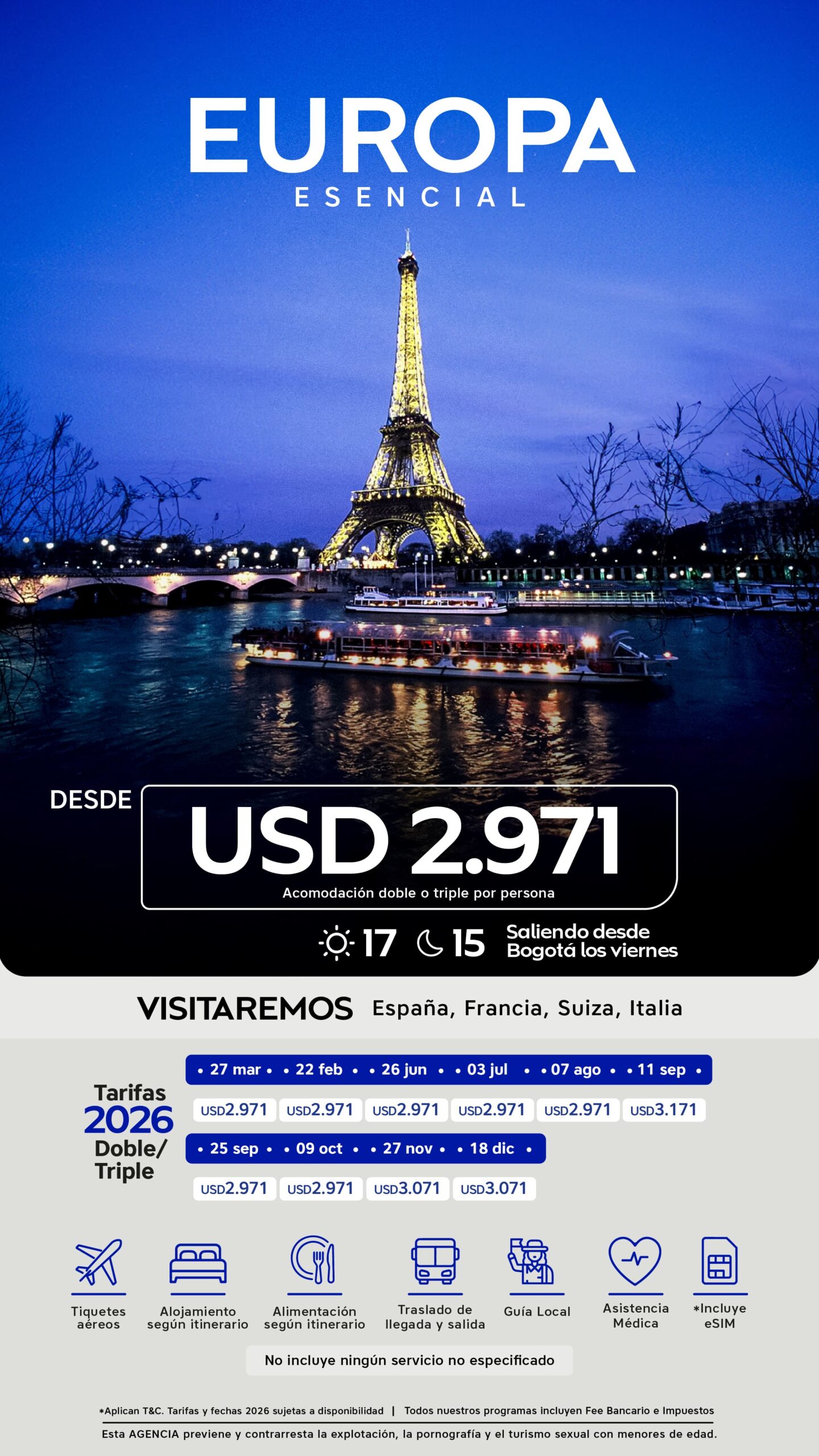27 marzo al 12 abril de 2026 22 mayo al 07 junio de 2026 26 junio al 12 julio de 2026 03 julio al 19 julio 2026 | USD 2.971 | USD 3.971 | USD 2.671 |
