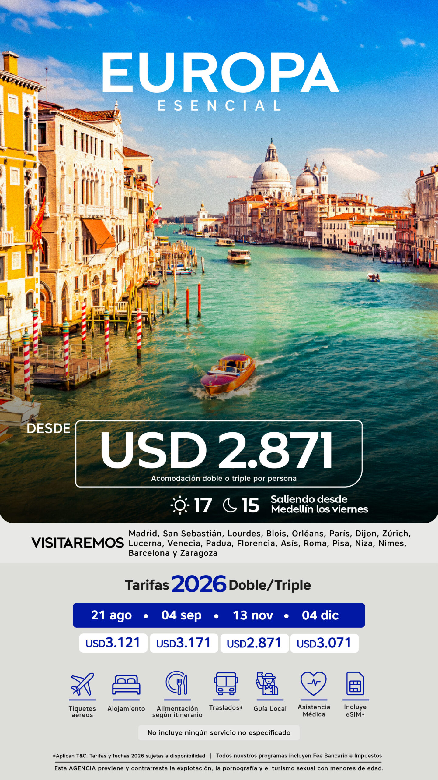 | 21 de agosto al 06 de septiembre de 2026 | USD 3.171 | USD 4.171 | USD 2.871 |