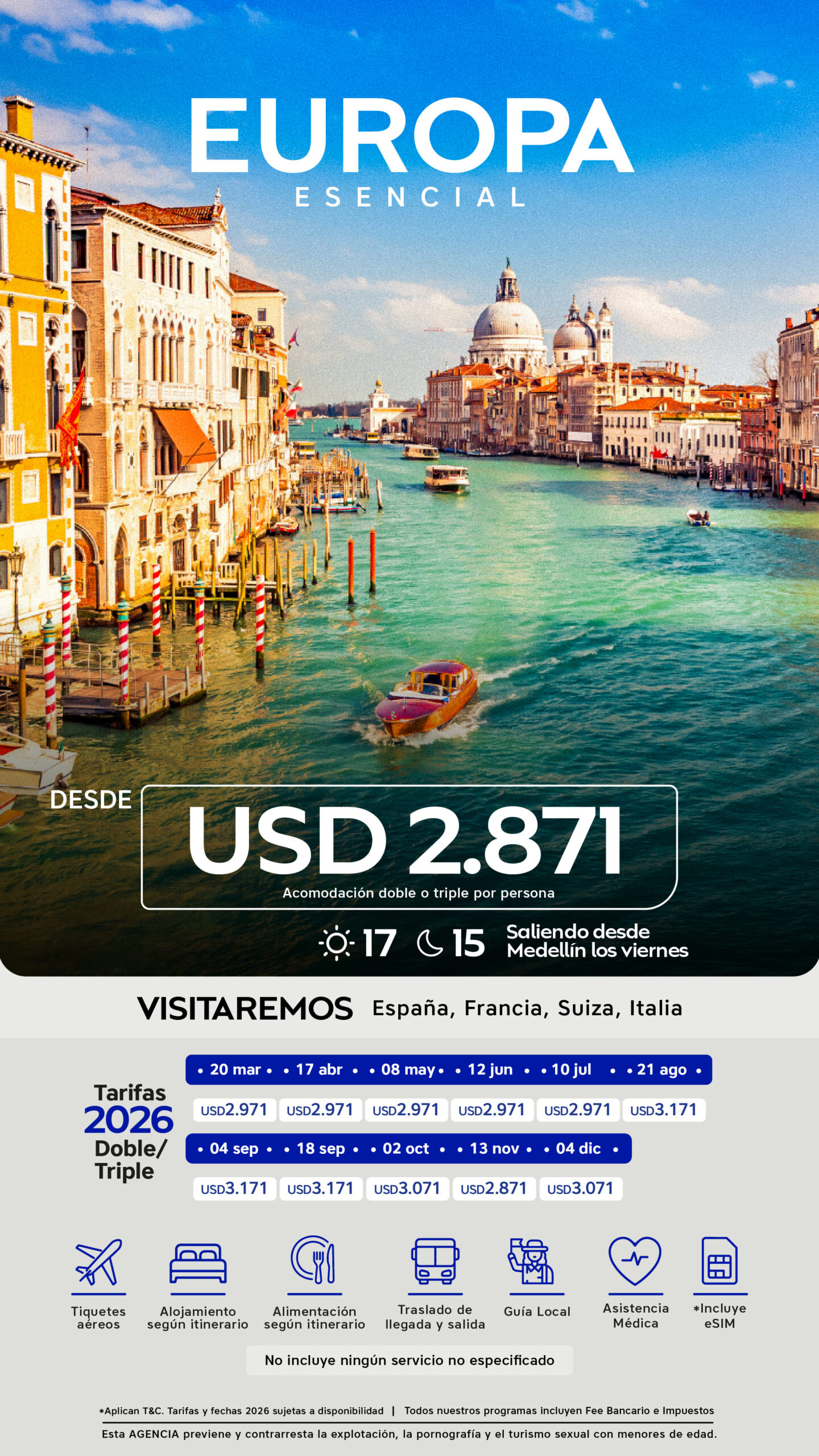 20 de marzo al 05 de abril de 2026 17 de abril al 03 de mayo de 2026 08 de mayo al 24 de mayo de 2026 12 de junio al 28 de junio 2026 10 de julio al 26 de julio de 2026 | USD 2.971 | USD 3.971 | USD 2.671 |