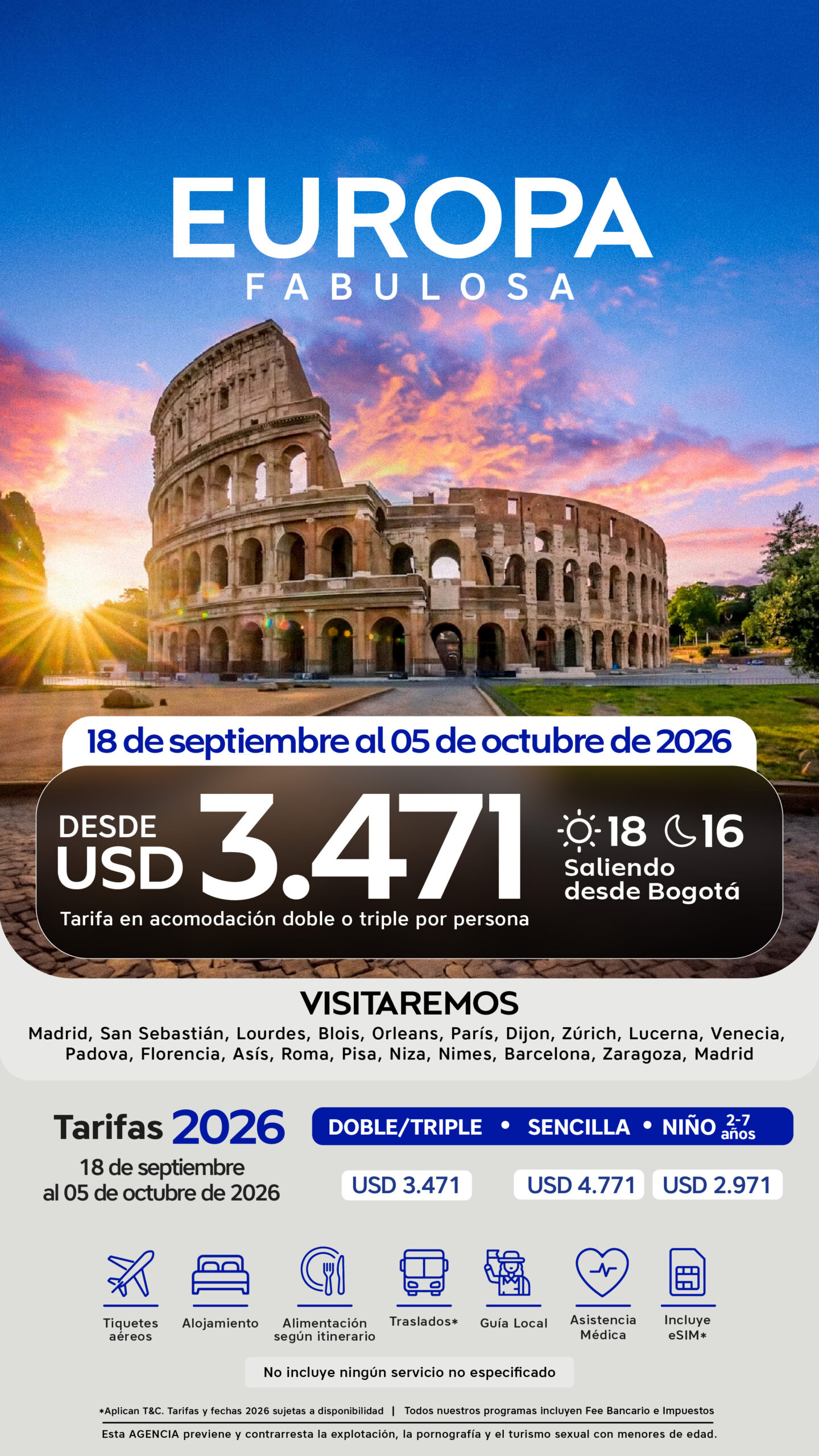 18 de septiembre al 05 de octubre de 2026 | USD 3.471 | USD 4.771 | USD 3.071 |