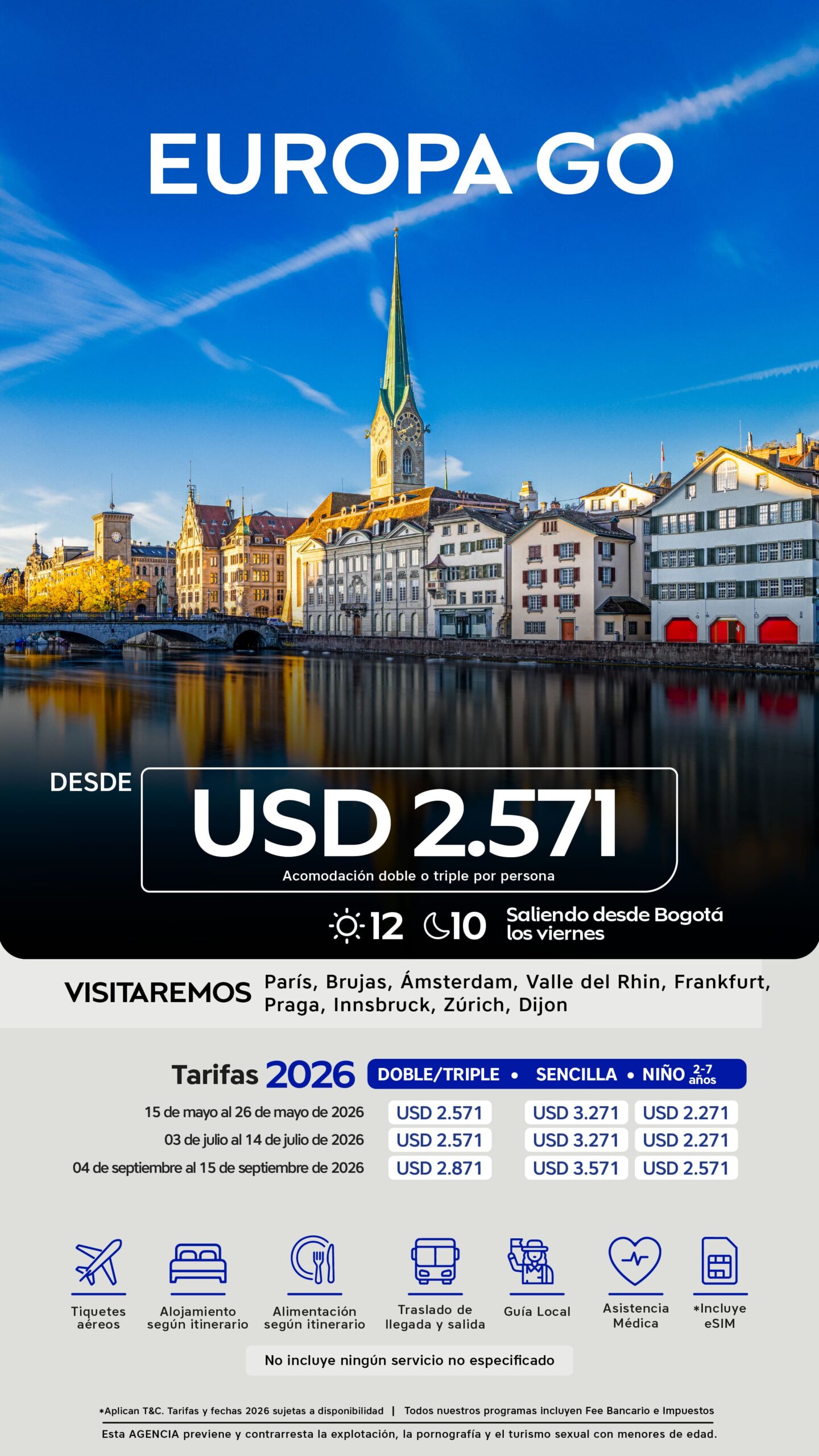 10 de abril al 21 de abril de 2026 15 de mayo al 26 de mayo de 2026 03 de julio al 14 de julio de 2026 | USD 2.571 | USD 3.271 | USD 2.271 |