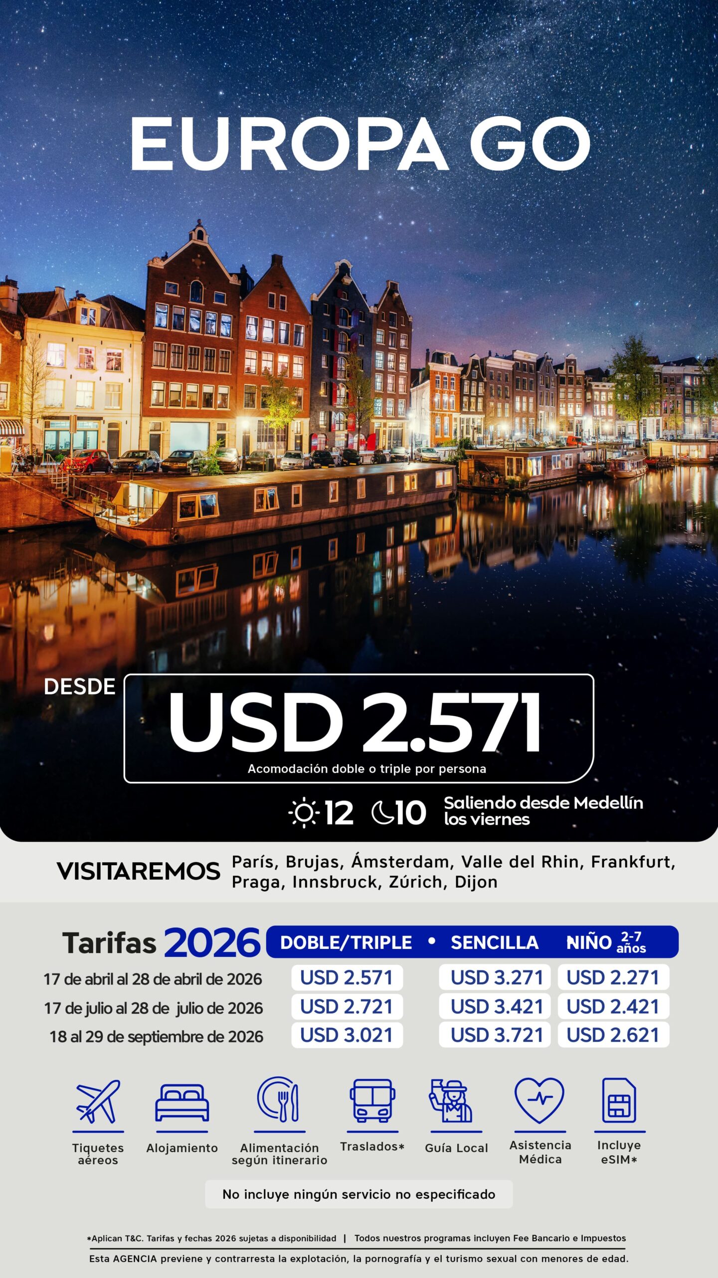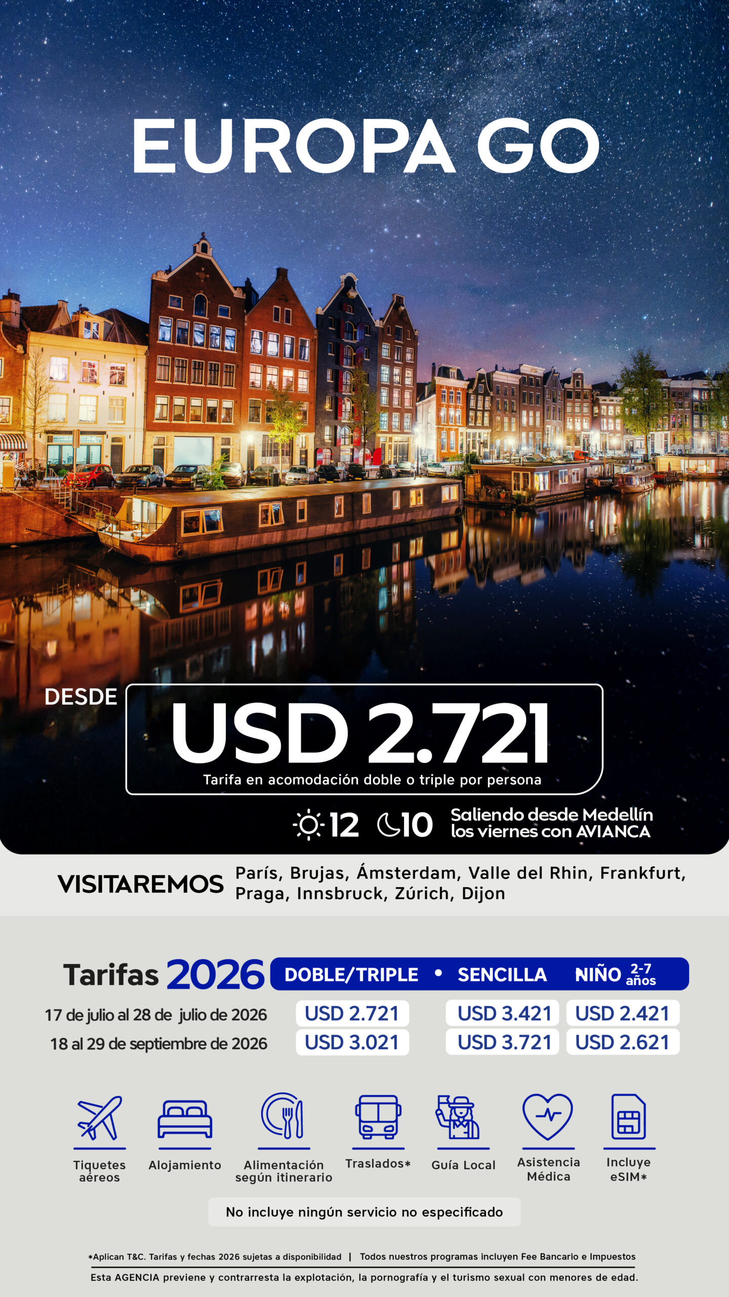- Tiquetes aéreos con impuestos incluidos en la ruta Medellín – Paris // Paris – Medellín, operados por la aerolínea Avianca, con una pieza de equipaje facturado de hasta 23 kg. (La ruta aérea puede tener tramos vía Bogotá según operación de la aerolínea)