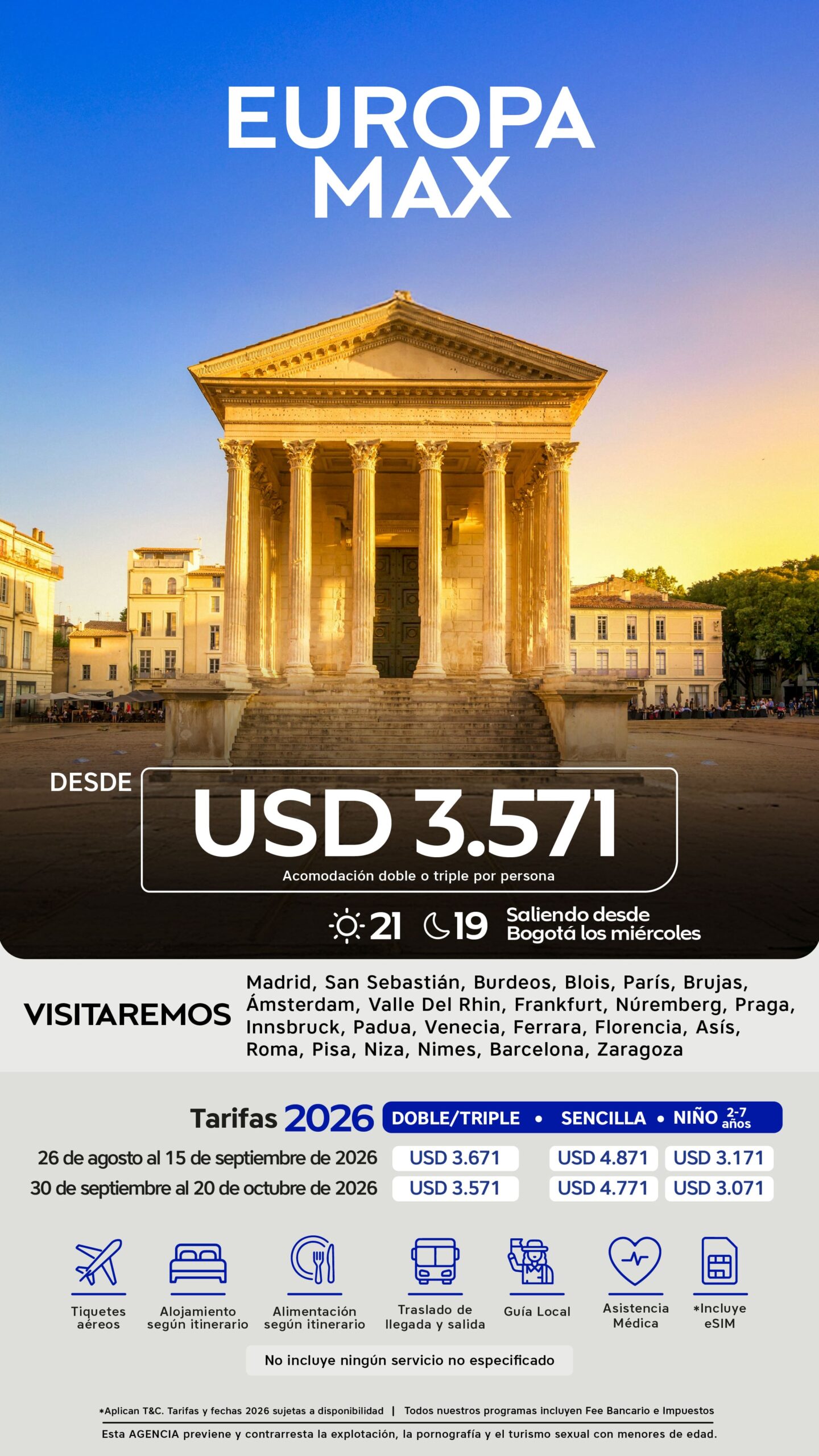 26 de agosto al 15 de septiembre de 2026 | USD 3.671 | USD 4.871 | USD 3.171 |