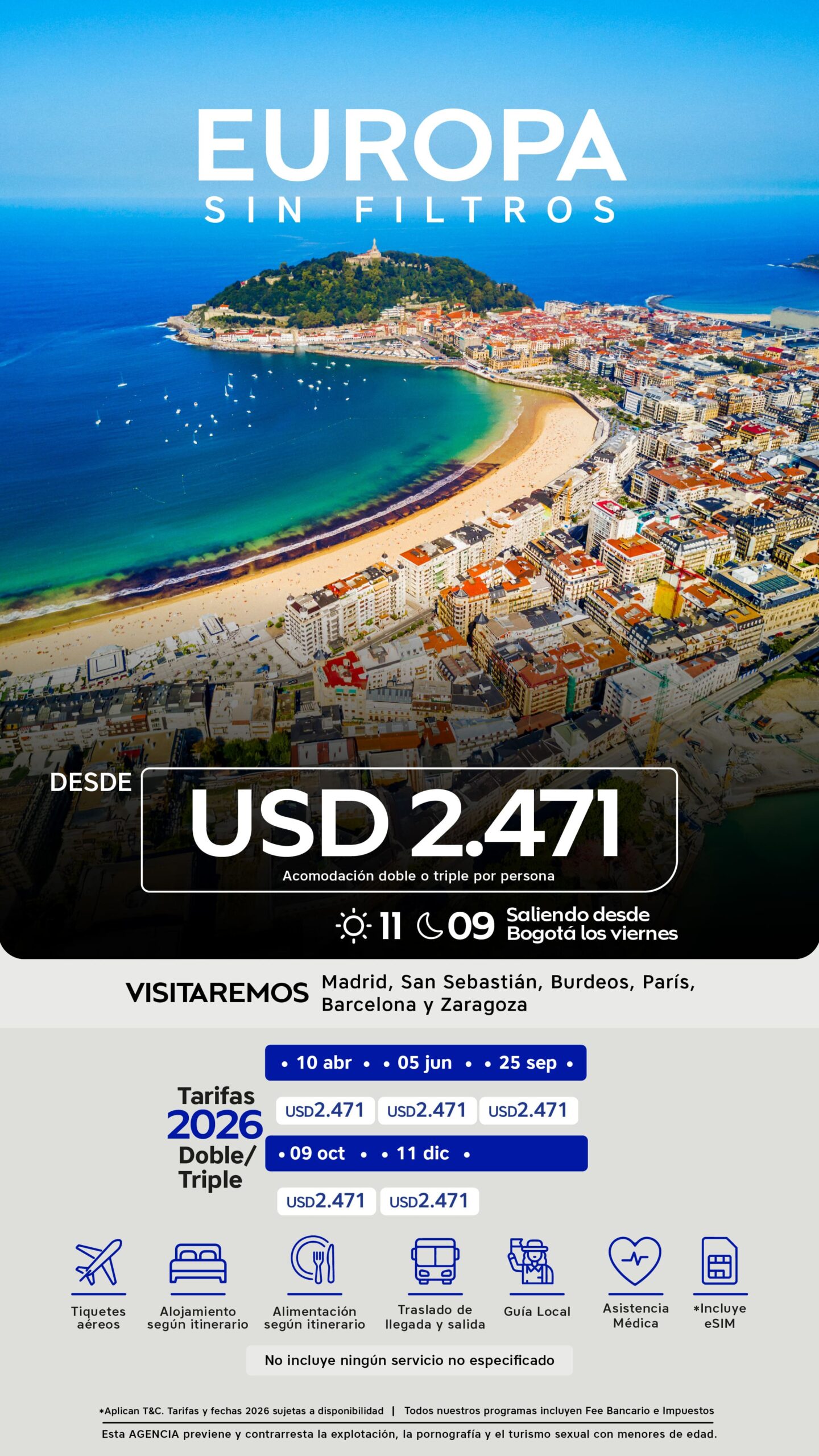 - Tiquetes aéreos con impuestos incluidos en la ruta Bogotá – Madrid // Madrid – Bogotá, operados por la aerolínea Avianca, con una pieza de equipaje facturado de hasta 23 kg.