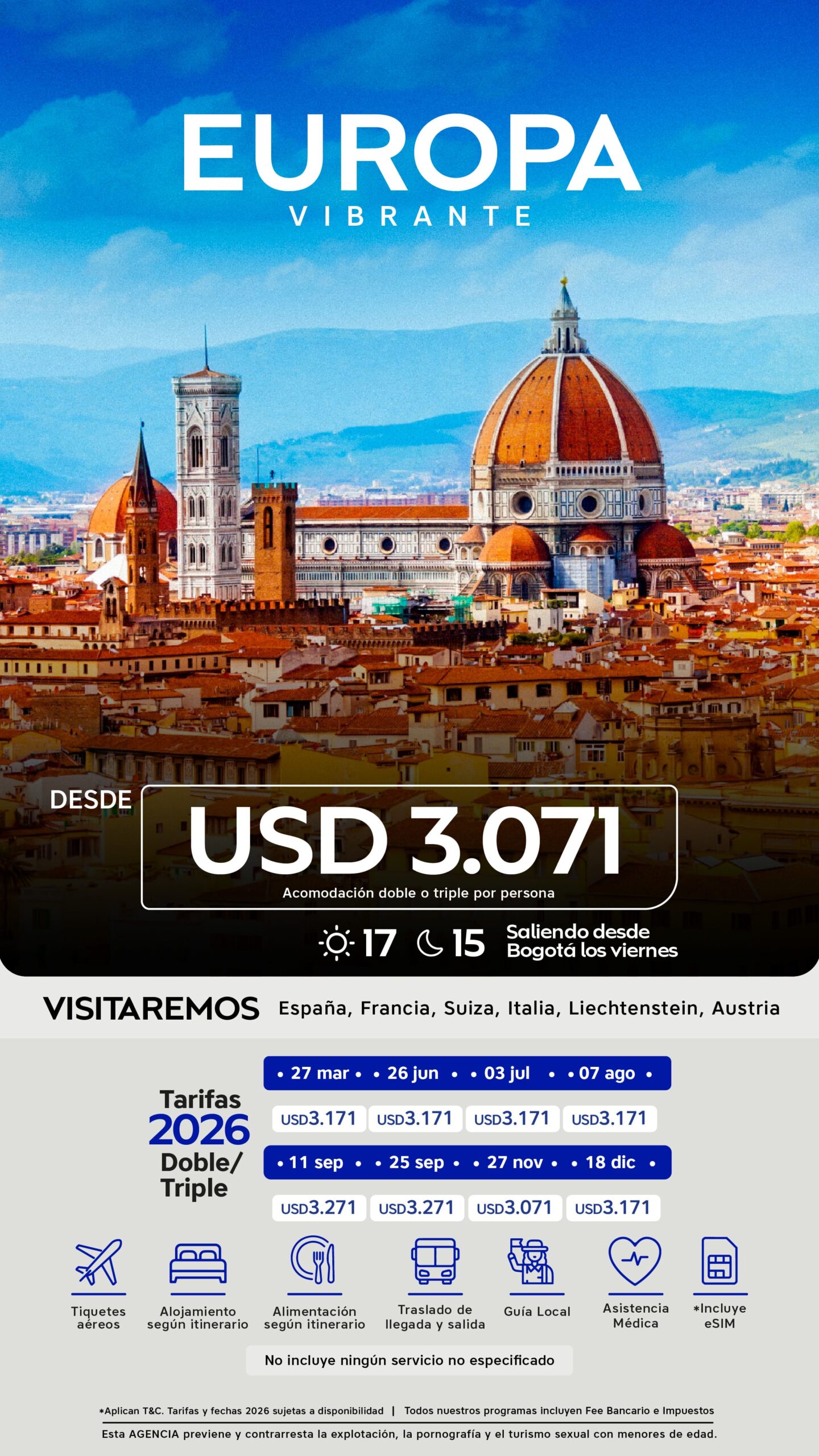 26 de junio al 12 de julio de 2026 03 de julio al 19 de julio de 2026 07 de agosto al 23 de agosto de 2026 | USD 3.171 | USD 4.171 | USD 2.771 |