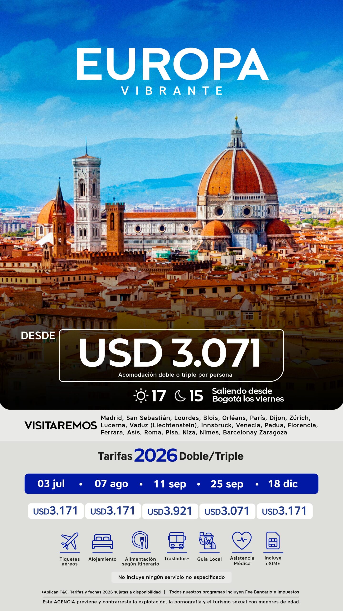 03 de julio al 19 de julio de 2026 07 de agosto al 23 de agosto de 2026 | USD 3.171 | USD 4.171 | USD 2.771 |