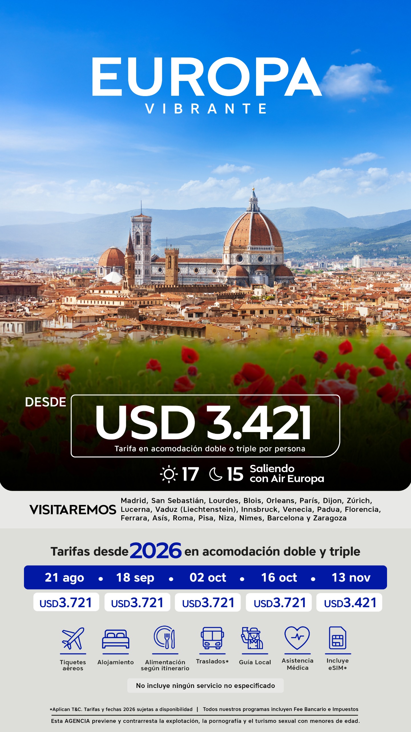 21 de agosto al 06 de septiembre de 2026 18 de septiembre al 04 de octubre de 2026 | USD 3.721 | USD 4.721 | USD 3.321 |