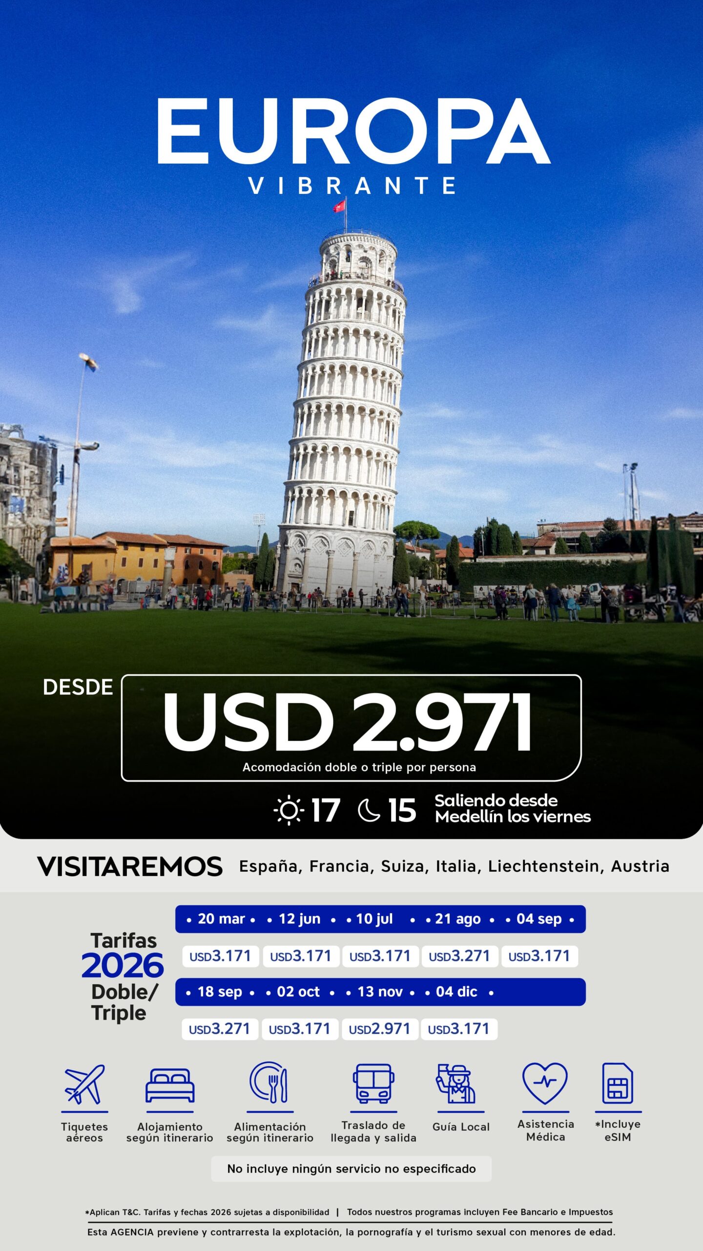 12 de junio al 28 de junio 2026 10 de julio al 26 de julio de 2026 | USD 3.171 | USD 4.171 | USD 2.771 |