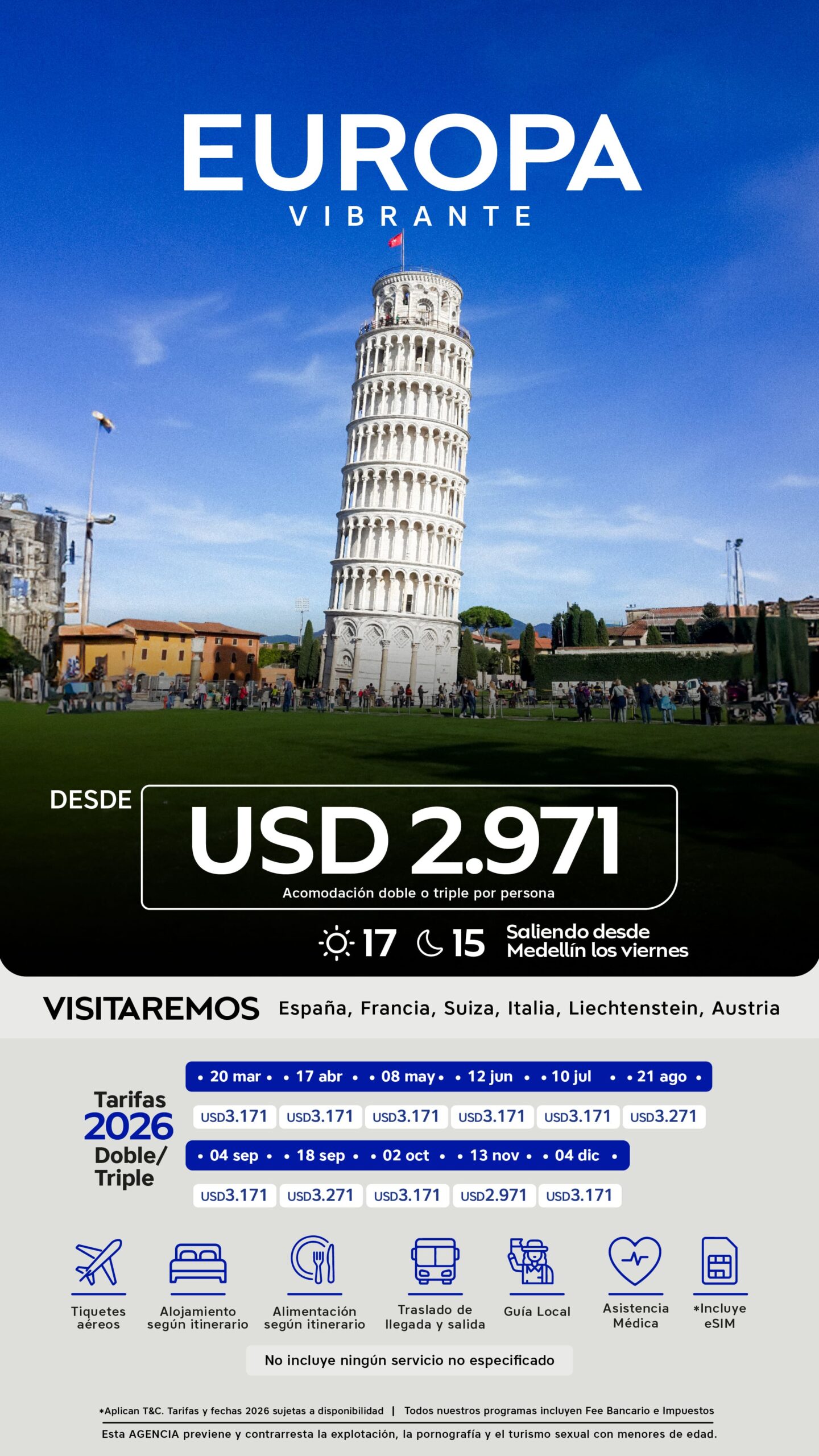 20 de marzo al 05 de abril de 2026 17 de abril al 03 de mayo de 2026 08 de mayo al 24 de mayo de 2026 12 de junio al 28 de junio 2026 10 de julio al 26 de julio de 2026 | USD 3.171 | USD 4.171 | USD 2.771 |
