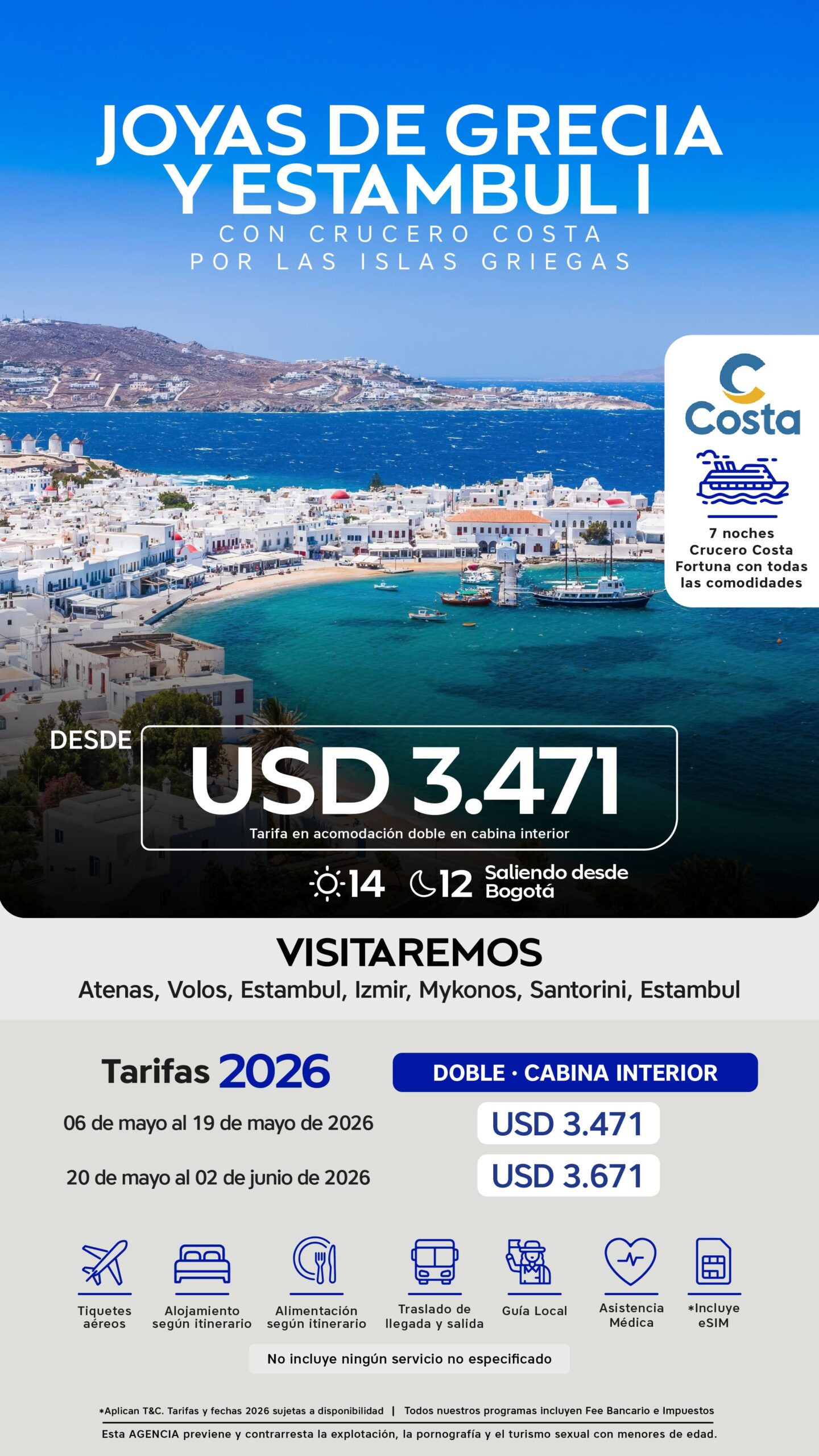 - Tiquete aéreo Bogotá – Atenas – Estambul – Bogotá, vía Turkish Airlines, con impuestos incluidos y 1 pieza de equipaje en bodega de hasta 23 kg.