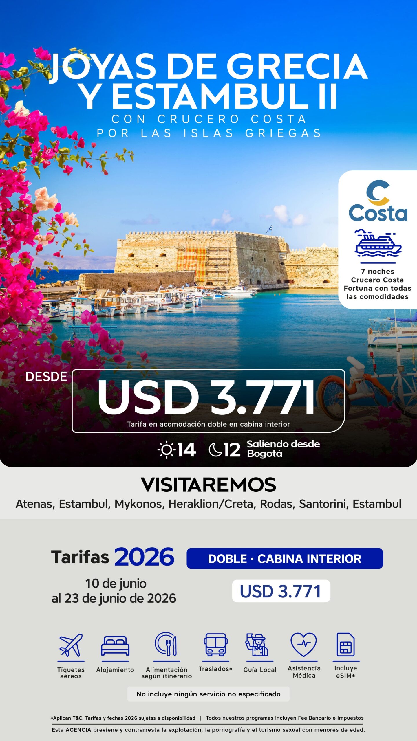 - Tiquete aéreo Bogotá – Atenas – Estambul – Bogotá, vía Turkish Airlines, con impuestos incluidos y 1 pieza de equipaje en bodega de hasta 23 kg.