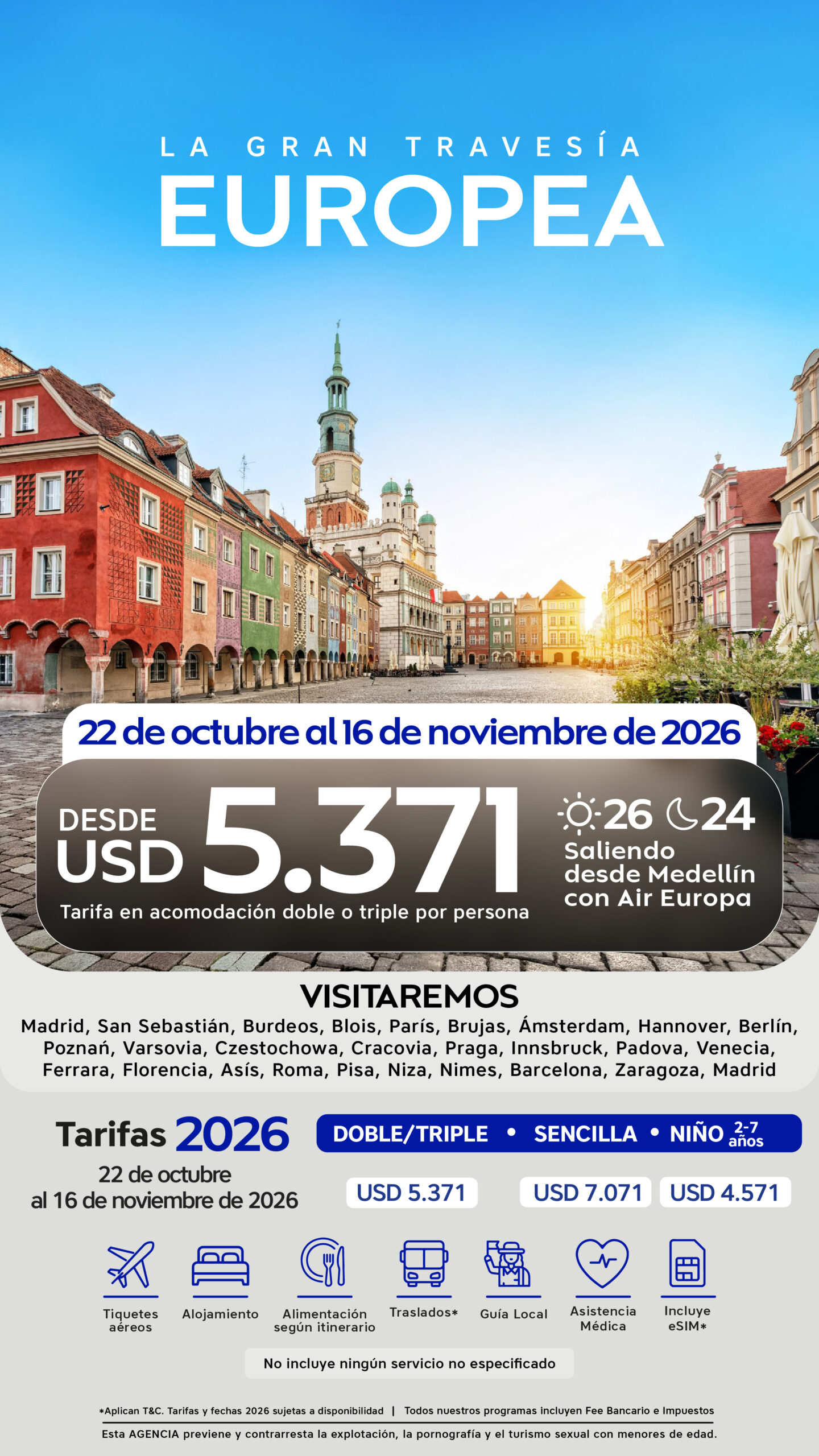 - Tiquetes aéreos con impuestos incluidos en la ruta Medellín – Madrid – Medellín, operados por la aerolínea Air Europa, con una pieza de equipaje facturado de hasta 23 kg.
