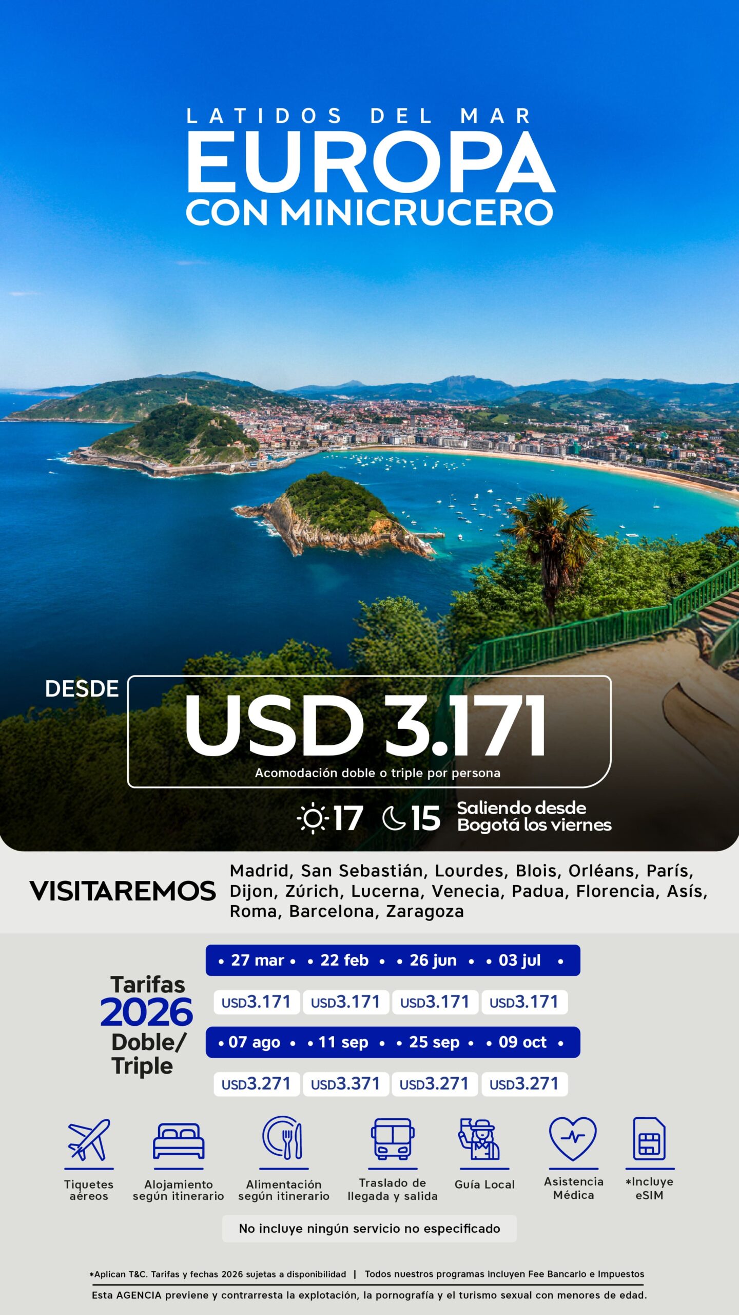 27 de marzo al 12 de abril de 2026 22 de mayo al 07 de junio de 2026 26 de junio al 12 de julio de 2026 03 de julio al 19 de julio de 2026 | USD 3.171 | USD 4.171 | USD 2.771 |