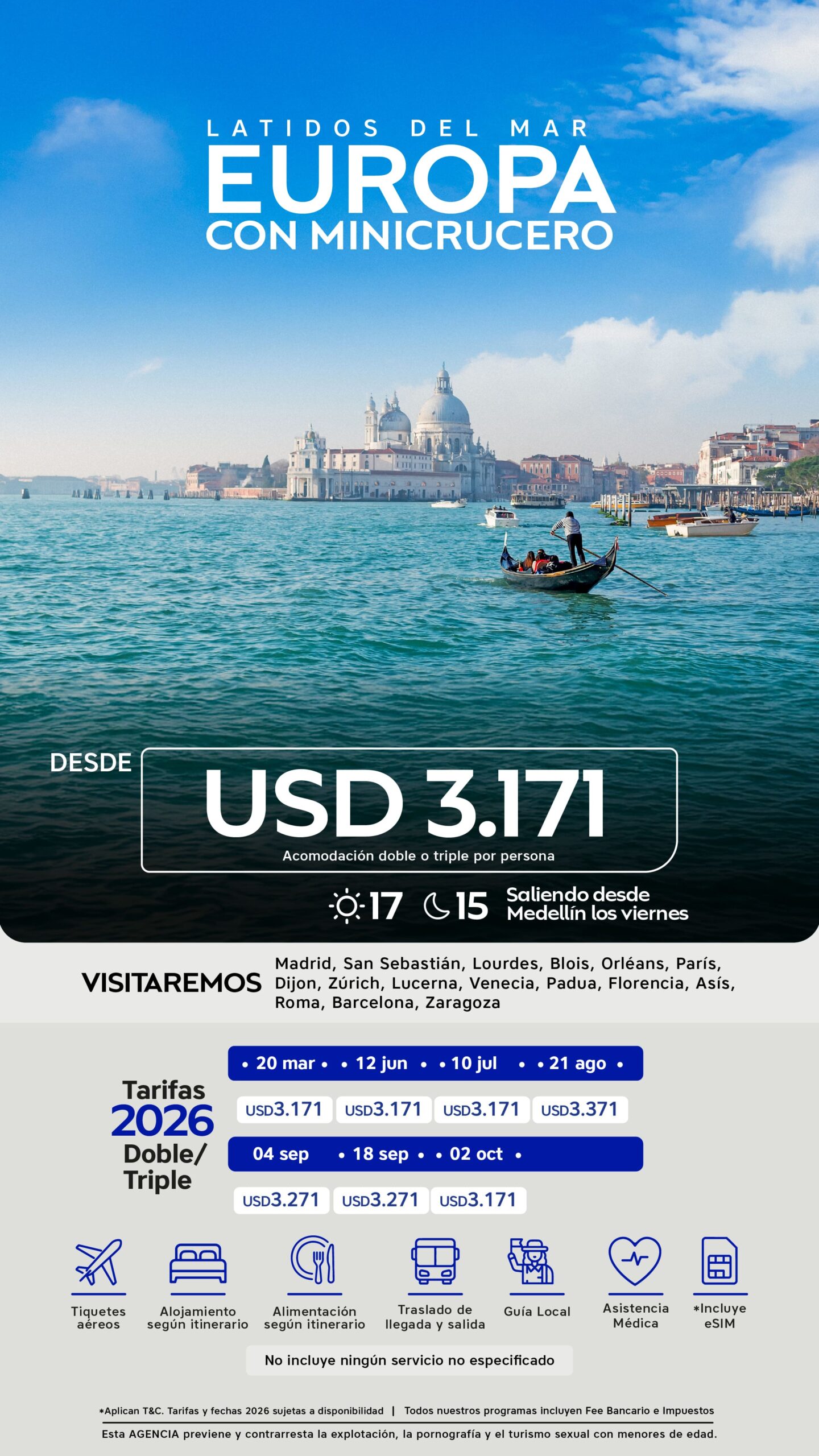 12 de junio al 28 de junio de 2026 10 de julio al 26 de julio de 2026 | USD 3.171 | USD 4.171 | USD 2.771 |