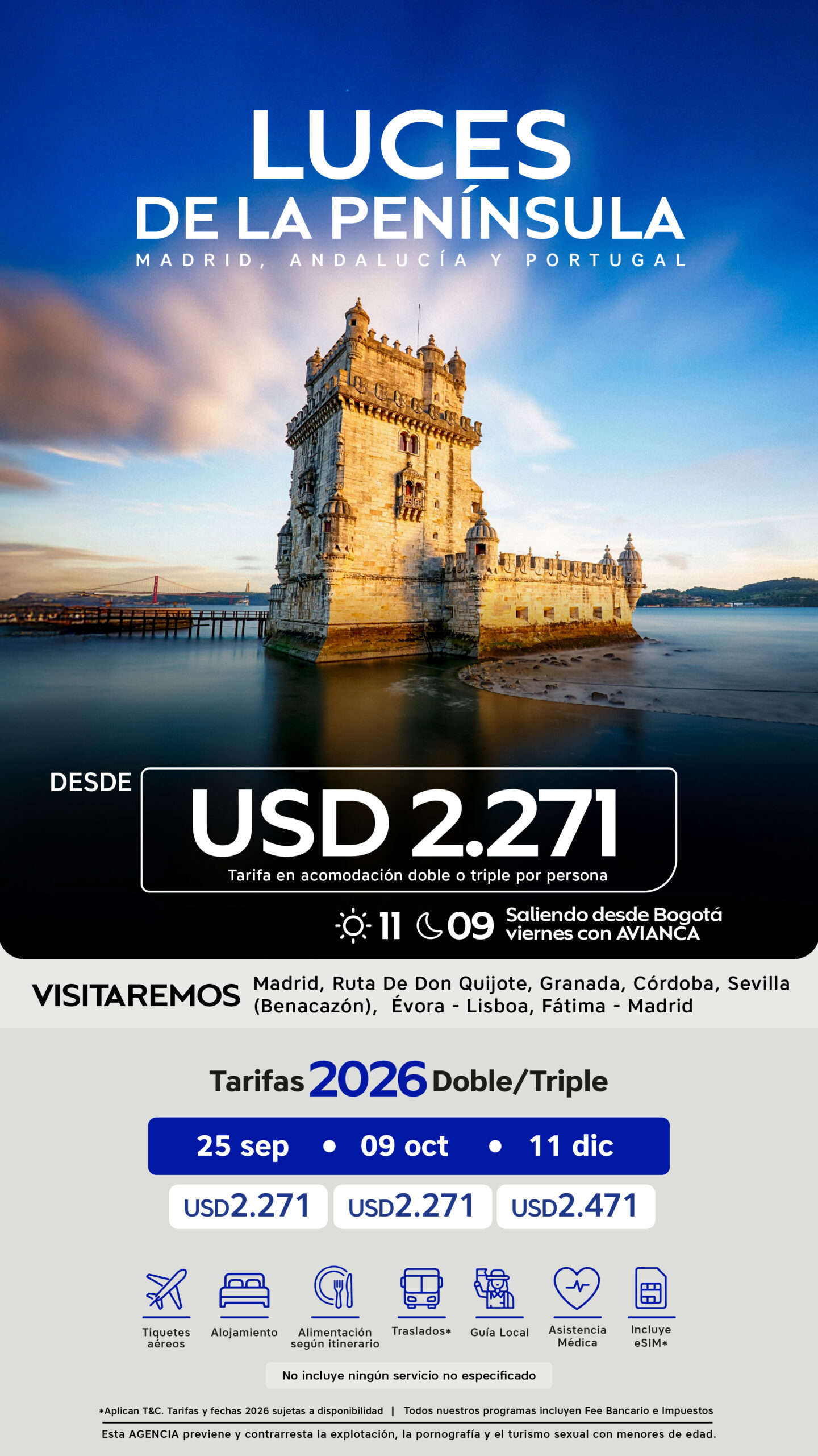 25 de septiembre al 05 de octubre de 2026 09 de octubre al 19 de octubre de 2026 | USD 2.271 | USD 2.871 | USD 2.071 |