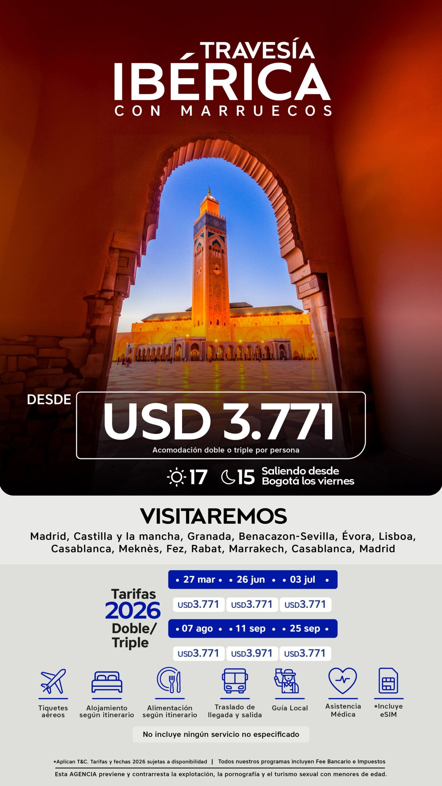 26 de junio al 12 de julio de 2026 03 de julio al 19 de julio de 2026 07 de agosto al 23 de agosto de 2026 | USD 3.771 | USD 4.771 | USD 3.171 |