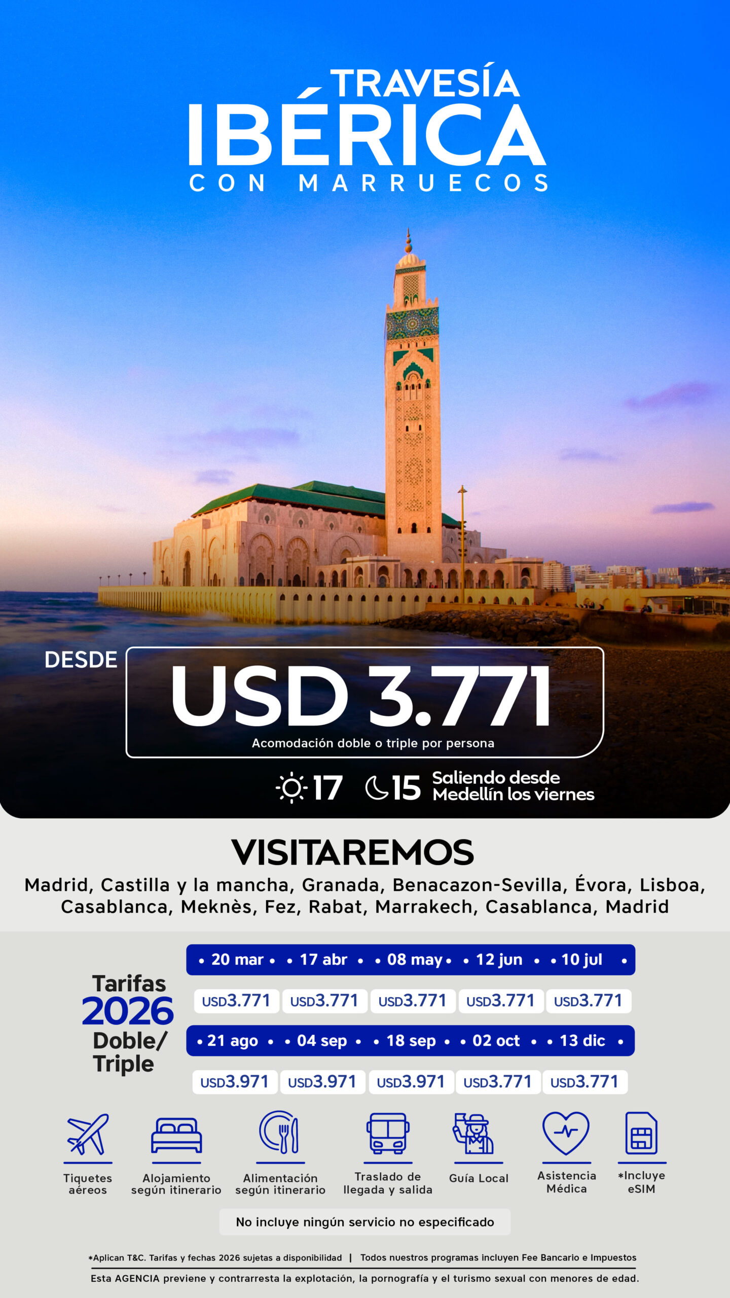 Tras el desayuno, traslado al aeropuerto. Volvemos a casa con la maleta llena de recuerdos, pero sobre todo con una nueva forma de mirar. Lo vivido en España, Portugal y Marruecos ya es parte de ti: los jardines secretos de Marrakech, la poesía de Lisboa, el arte andalusí, los sabores del Alentejo, el canto del muecín y el flamenco entre sombras. Te llevas un viaje, sí… pero también te llevas una transformación. Vuelo de regreso a América. Hasta pronto.