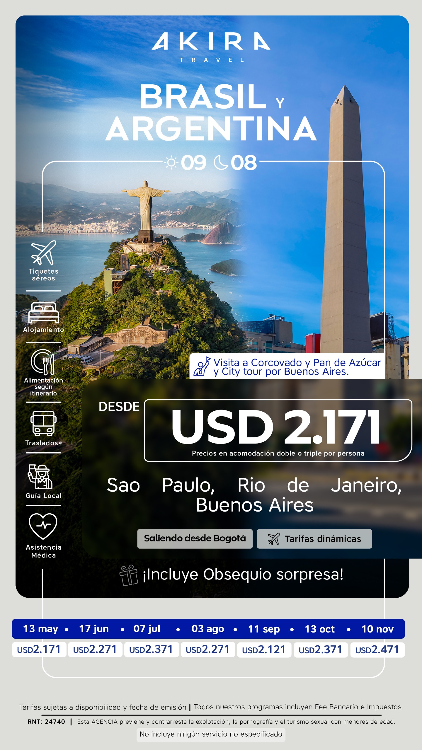 • Tiquete aéreo con impuestos Bogotá – Sao Paulo // Sao Paulo – Rio de Janeiro // Rio de Janeiro – Buenos Aires // Buenos Aires – Bogotá con Avianca.