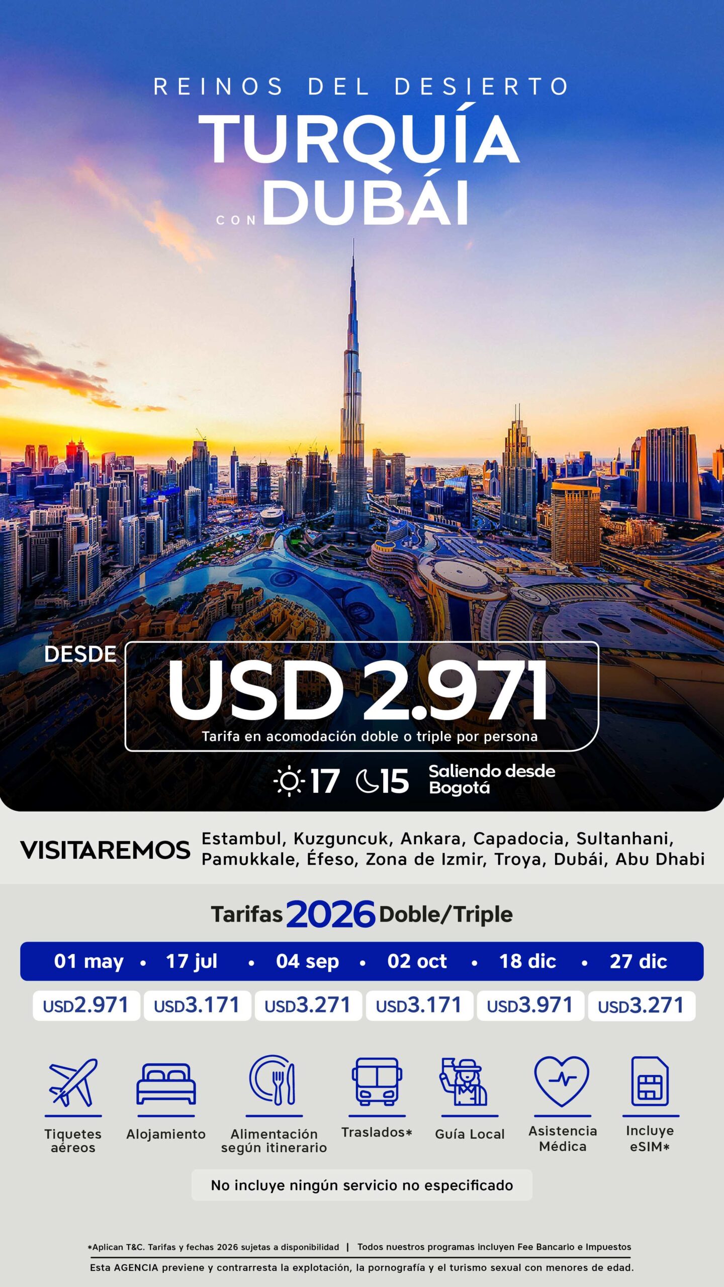 - Propinas obligatorias por persona de USD 55 en Turquía Y USD 35 en Dubái (se pagan en destino).