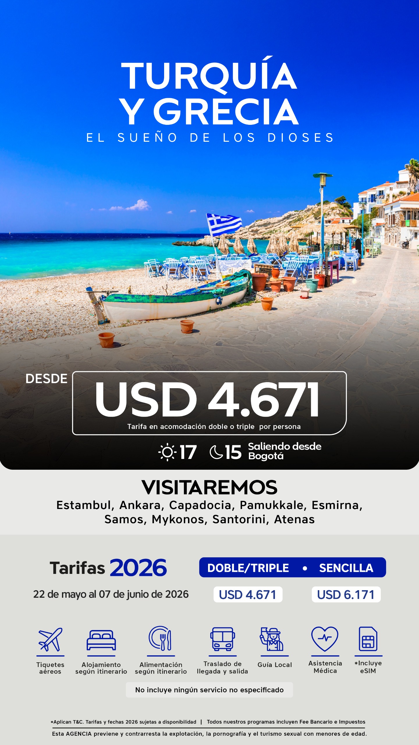 - Tiquete aéreo internacional en la ruta Bogotá – Estambul / Atenas – Estambul / Estambul – Bogotá, con impuestos incluidos, operado por Turkish Airlines. Incluye una pieza de equipaje en bodega de hasta 23 kg.